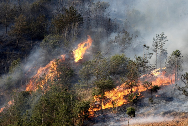 2月28日17时,在昆石高速公路清水沟2号隧道至1号隧道段拍摄的火势蔓延情况。火借风势迅速蔓延。