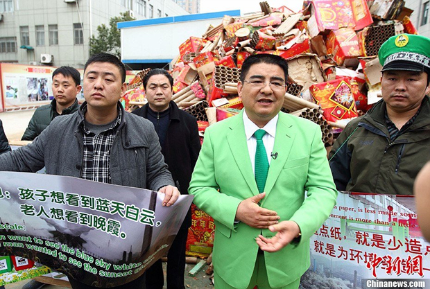 2月21日,11位来自全国各地、自称是污染企业老板的男子聚在江苏黄埔再生资源利用有限公司陈光标的公司内,在一大堆已经燃放后的烟花爆竹废品前戴上象征绿色出行的绿帽子,举起写有“不放烟花、少造点纸、支持正能量、给力垃圾分类”等牌子,用一种近乎行为艺术的方式响应陈光标日前发出的环保号召。图为陈光标(右二)与他们一起宣传环保。