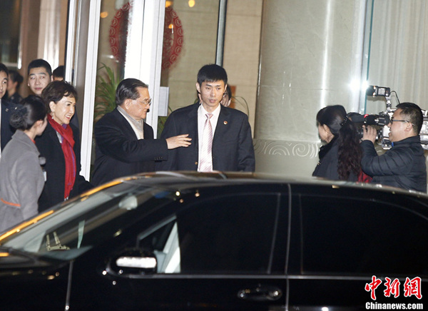 国民党荣誉主席连战率领台湾各界人士访问团于2月24日下午抵达北京,开始3天3夜的访问行程。此行定调为“走春访旧”。连战表示,此行主要是增进交流,并且见见老朋友、新朋友、好朋友,非常单纯。图为他和夫人走出贵宾楼。