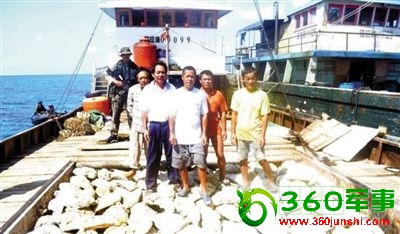 4月11日,菲律宾外交部发布的图片显示,菲律宾海军一名士兵持枪站立在中国渔船上,位于其前方的是中国渔民。载有大型蛤蜊的中国渔船在中国黄岩岛海域被菲律宾海军船只违法拦截,从而引发菲律宾战舰同中国渔政船的对峙。资料图片