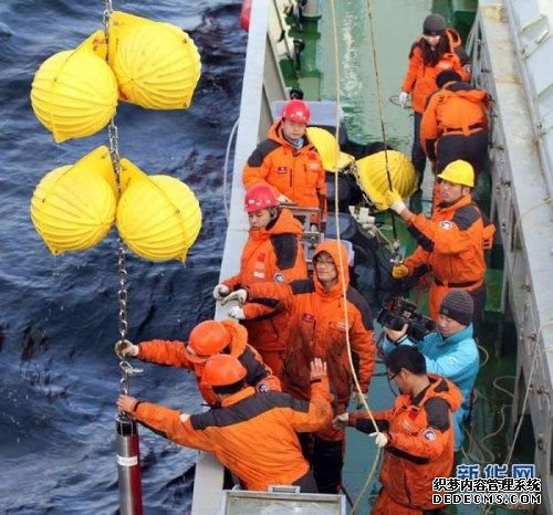 9月8日,科考队员将潜标从海面上拉上“雪龙”号甲板。