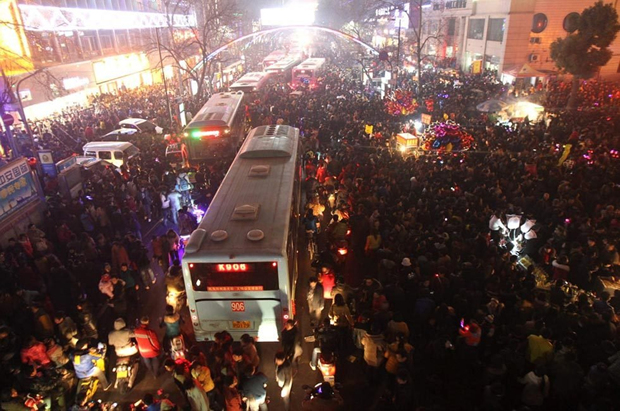 2013年2月24日,正月十五元宵节,在郑州人民公园门口哭喊声一片,车辆全部拥堵到路上成了停车场。