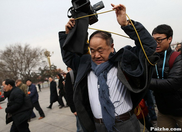3月2日,北京,摄像机的线缠莫言身上,他一言不发,边走边解开线。