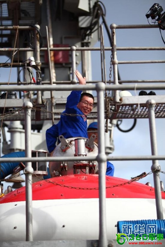 北京时间6月15日7时,3名试航员乘“蛟龙”号载人潜水器开始进行7000米级海试第一次下潜试验。这是试航员崔维成进入“蛟龙”号(6月15日摄)。